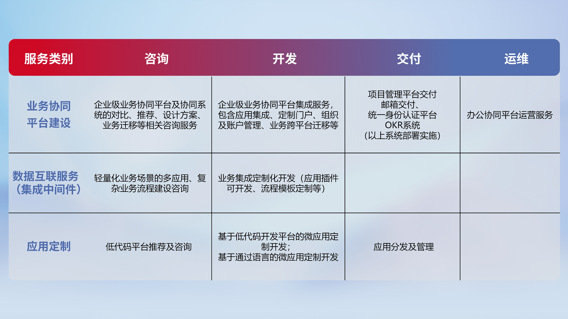 针对钉钉、、企微、、、、IDaas等平台级产品提供产品的规划、、、、方案、、、、交付、、、定制化开发等服务,,实现如统一协同办公、、、智能客户服务、、、混合会议管理、、智能数据查询、、、、等业务场景,,,实现数字化转型。。。。