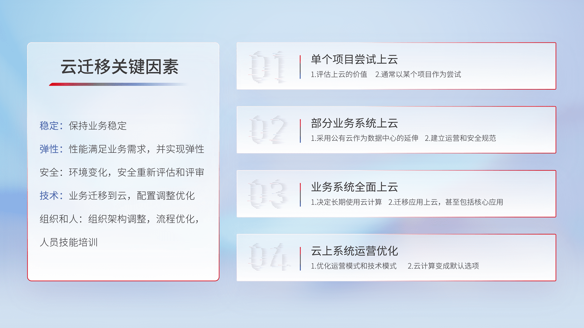 结合实际业务,,,从规划设计、、、云平台选型、、、云原生改造、、、数据迁移、、、集成交付,,迁移全过程为客户识别最佳上云路径,,做好风险识别管理,,设计网络架构、、身份权限、、安全审计合规、、操作审计、、、日志审计、、、、监控告警策略、、、、多站点容灾设计等,,对云上基础设施进行整体规划,,提升IT治理水平,,,,以满足弹性、、、高可用、、高性能的需求。。。。