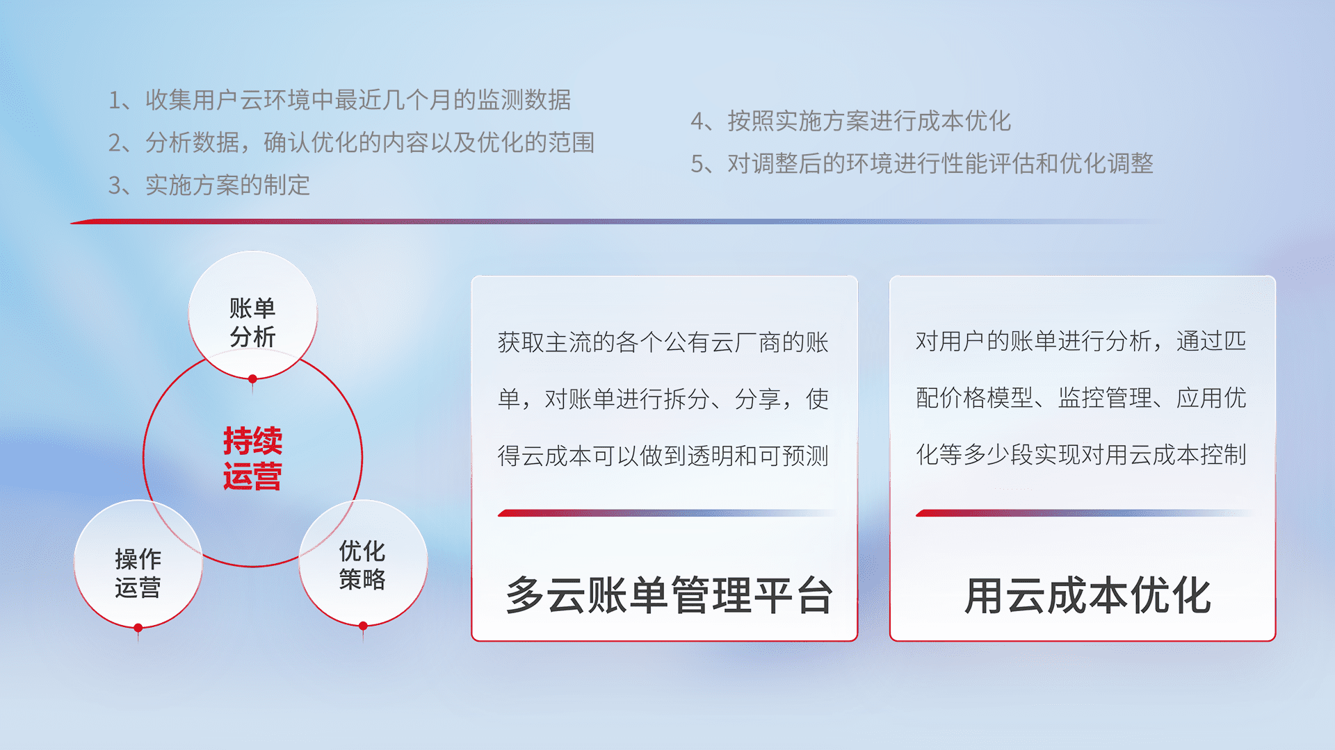 通过多云纳管,,,以统一的资源数据模型把客户的云资源进行抽象和封装,,,,进而实现对多云资源的统一操作,,,,保障云资源管理的可靠性、、、、稳定性与可用性。。量身定制化运维内容,,配置、、开发运维、、、、补丁管理、、、备份、、监控、、、、认证和访问管理、、审计和日常巡检等,,,,保障在用云过程中的可靠度,,,,稳定度以及高可用率。。。。